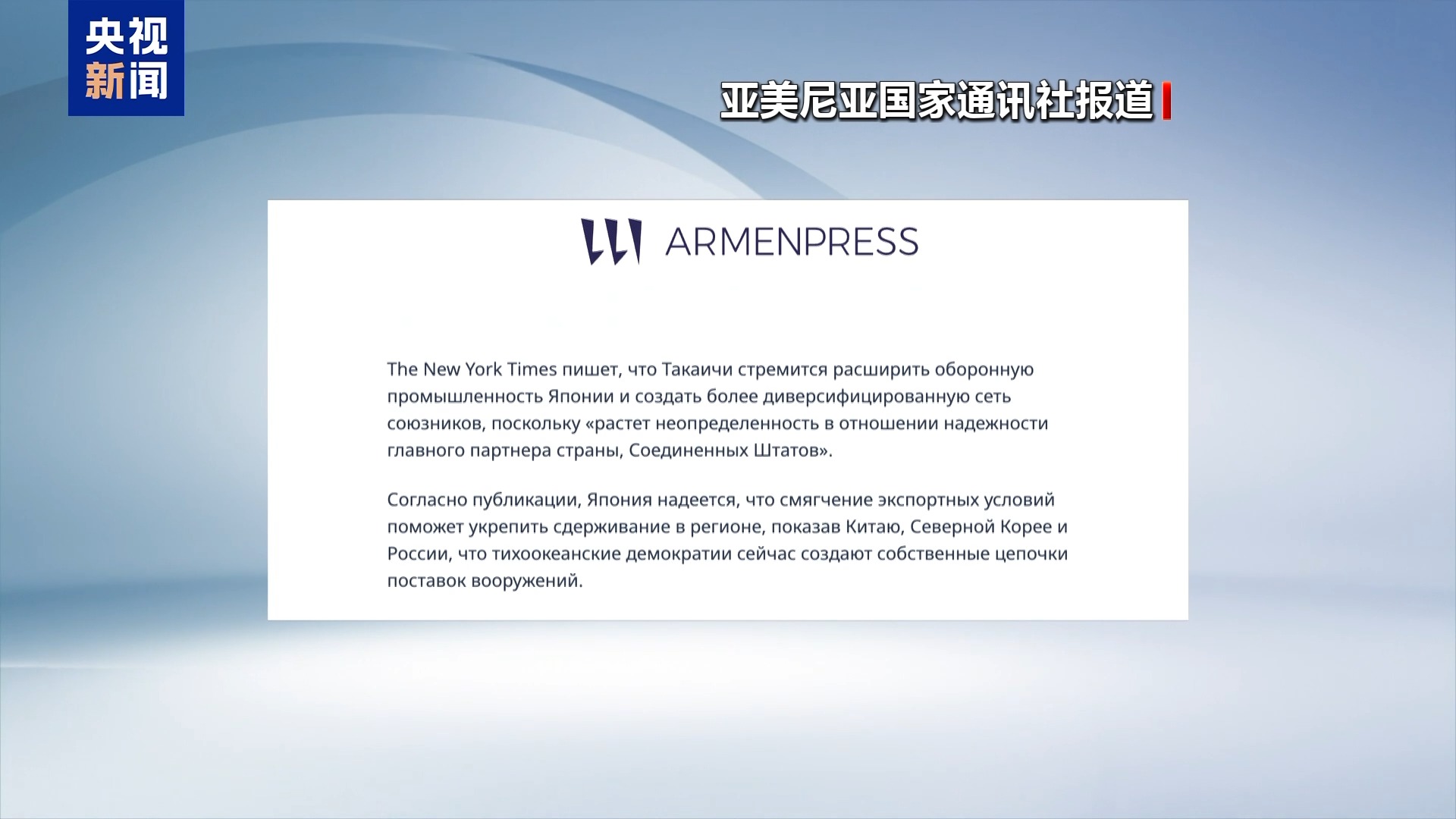 亚美尼亚国家通讯社21日援引《纽约时报》的分析报道称,日本企图借此表明其正在建立独立的武器供应链,意在加强对太平洋地区的威慑。报道称,鉴于“美国这一主要盟友的不确定性”,高市早苗也在寻求扩大国防工业,建立更加多元化的网络。